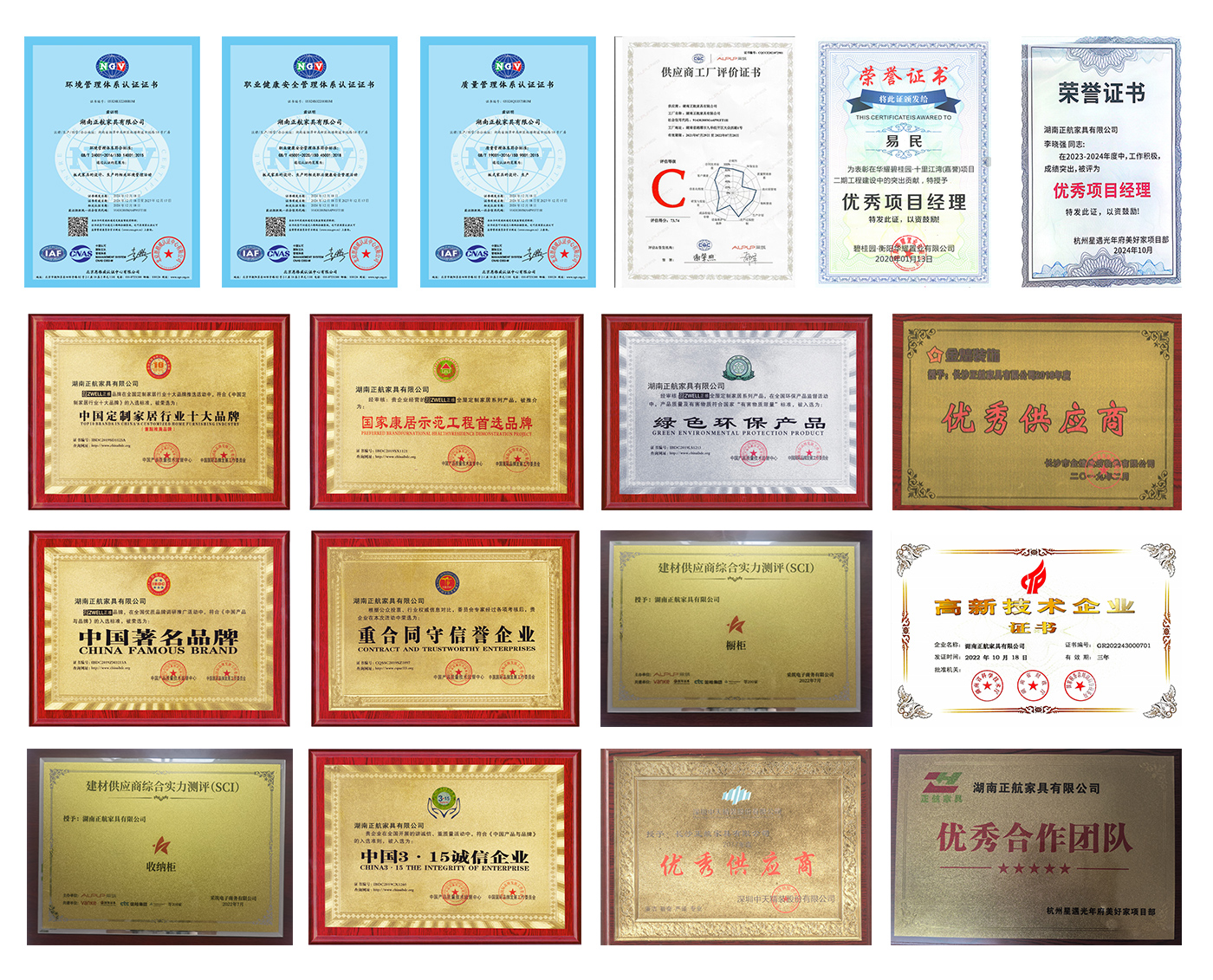 湖南正航家具有限公司通过了ISO9001:2015质量管理体系认证、ISO4001:2015环境管理体系认证、ISO45001:2018职业健康安全管理体系认证,拥有国家高新技术企业、中国定制家居行业十大品牌、国家康居示范工程首选品牌、绿色环保产品认证品牌、中国3·15诚信企业、中国著名品牌、重合同守信誉企业等资质荣誉。